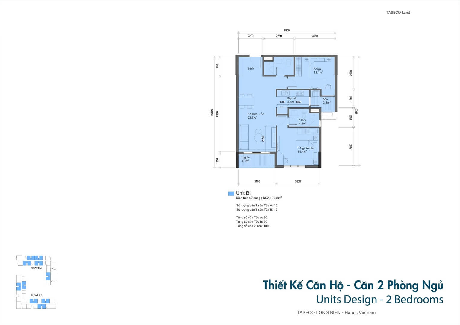 Căn hộ 2 phòng ngủ: 78 – 80 m², lý tưởng cho gia đình nhỏ.